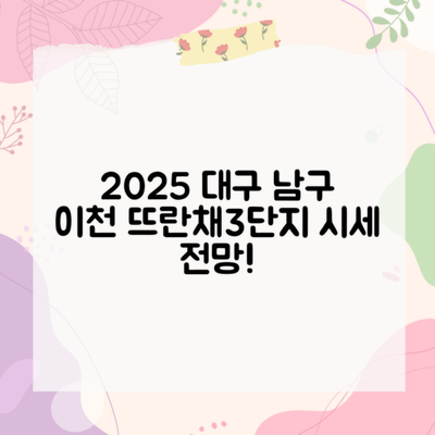 대구시 남구 이천동 이천뜨란채3단지 아파트의 2025년 시세는 여러 요인에 따라 변화할 것으로 예상됩니다. 다음은 이 아파트에 대한 3가지 주요 전망입니다.